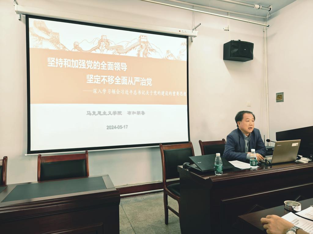会上,马克思主义学院布和朝鲁教授以《坚持和加强党的全面领导 坚定不移全面从严治党》为题,从历史的启示、现实的挑战、“十三个坚持”的重要内容三个方面进行了全面、系统、深入的讲解,回顾了全面从严治党的历史渊源,阐述了大党治大国的理论思路,并着重分析了“十三个坚持”的重要内容。布和朝鲁教授的讲座深入浅出、理论联系实际,对于全院师生党员进一步学习领会习近平总书记关于党的建设的重要思想,深入了解党纪学习教育与全面从严治党的价值意蕴,加强和改进学校党建工作,具有很强的指导意义。