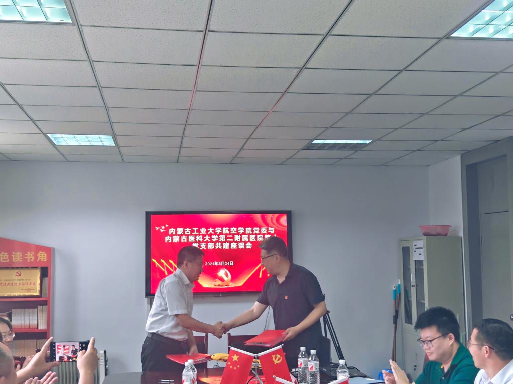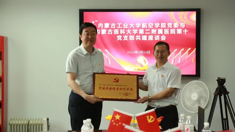 共建活动座谈会上,郭俊宏与杨学军分别介绍了各自单位的总体情况及党建工作的开展情况,双方就如何开展高质量的党建共建工作,并在理论共学、资源共享、活动共办、党建共建、发展共谋等方面进行了深入探讨交流。随后,双方签订了党建共建协议书,航空学院党委授予内蒙古医科大学第二附属医院第十党支部“党建共建校医合作单位”牌匾。