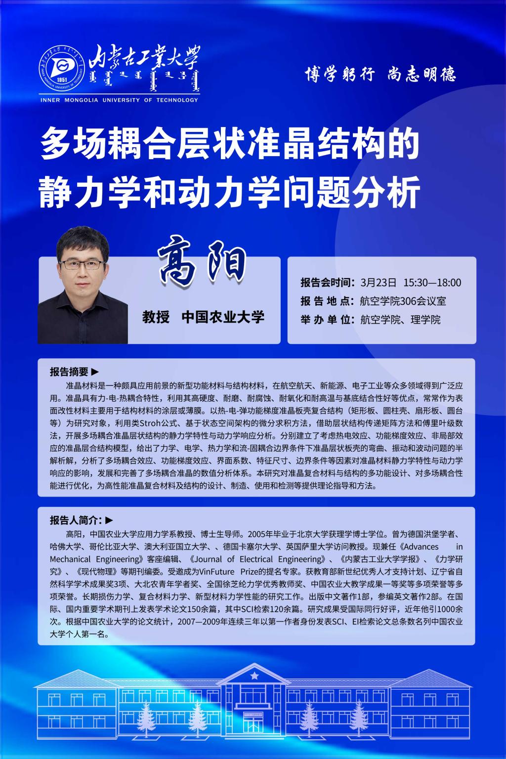 讲座题目:多场耦合层状准晶结构的静力学和动力学问题分析