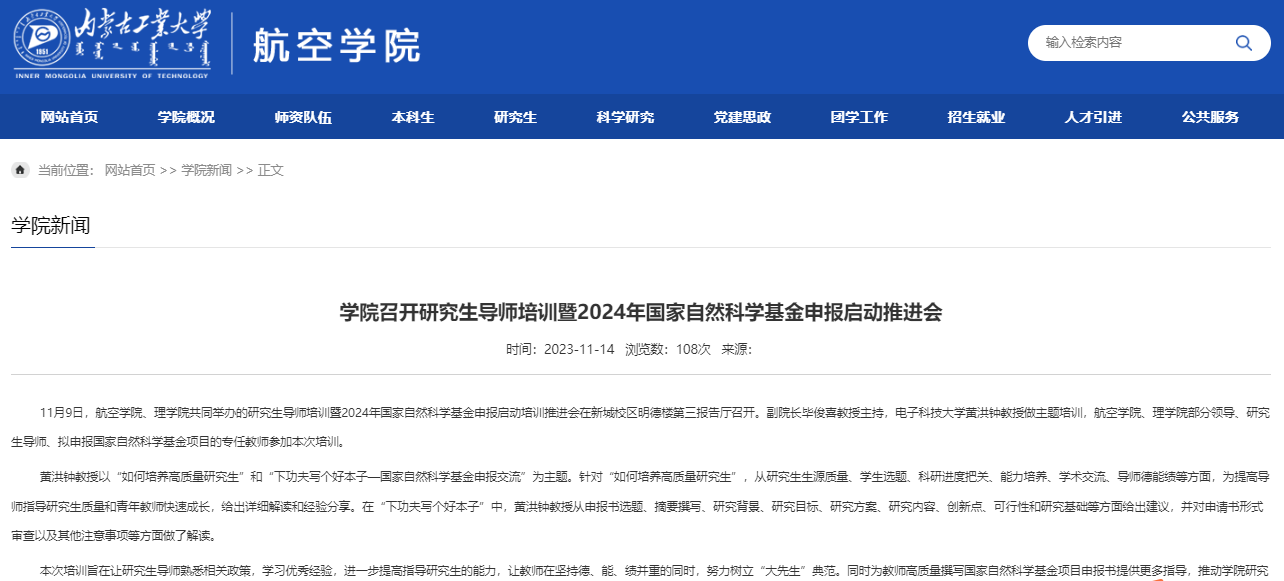 第一轮论证:2023年11月9日,航空学院、理学院共同举办的研究生导师培训暨2024年国家自然科学基金申报启动培训推进会在新城校区明德楼第三报告厅召开。副院长毕俊喜教授主持,电子科技大学黄洪钟教授做主题培训,航空学院、理学院部分领导、研究生导师、拟申报国家自然科学基金项目的专任教师参加本次培训。