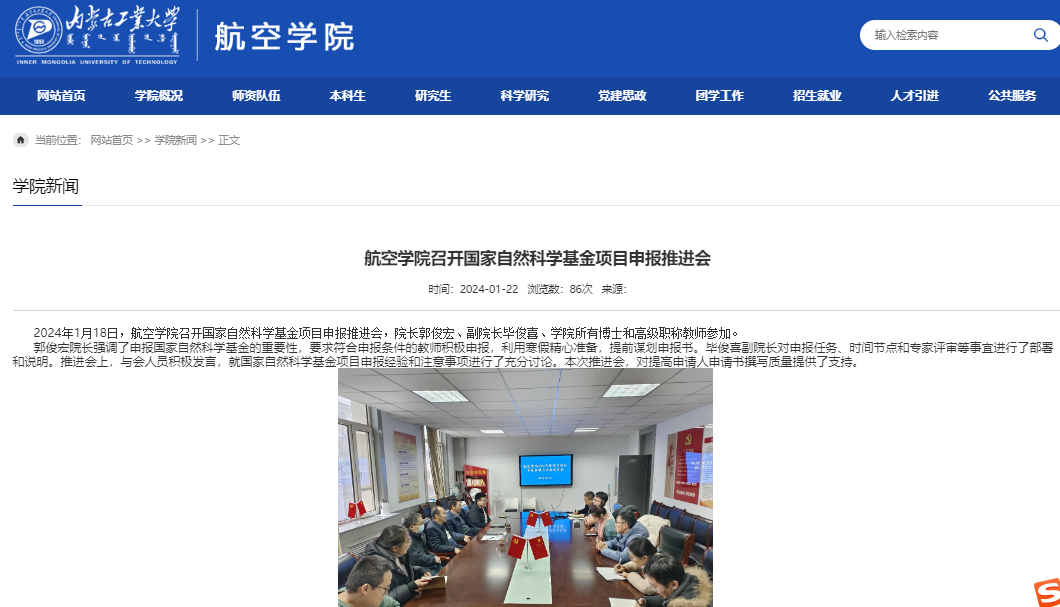 第二轮论证:2024年1月18日,航空学院召开国家自然科学基金项目申报推进会,院长郭俊宏、副院长毕俊喜、学院所有博士和高级职称教师参加。郭俊宏院长强调了申报国家自然科学基金的重要性,要求符合申报条件的教师积极申报,利用寒假精心准备,提前谋划申报书。毕俊喜副院长对申报任务、时间节点和专家评审等事宜进行了部署和说明。推进会上,与会人员积极发言,就国家自然科学基金项目申报经验和注意事项进行了充分讨论。本次推进会,对提高申请人申请书撰写质量提供了支持。