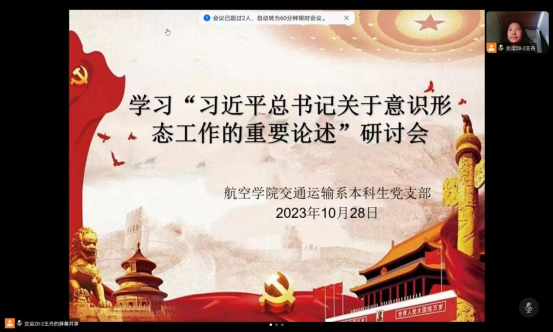 2023年10月24日,航空学院交通运输专业学生党支部召开专题学习研讨会,深入学习习近平总书记关于意识形态工作的重要论述,深入学习以习近平同志为核心的党中央引领宣传思想文化事业发展纪实。党支部全体党员、预备党员参与,并结合学习内容交流发言,深入研讨。